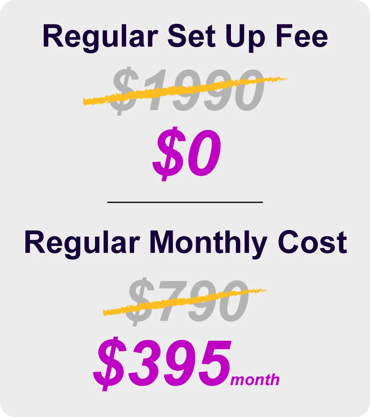 Normally, our comprehensive marketing package costs $1,990 for set up and $790 per month. But for the first 5 clients who qualify, we’re waiving the set-up fee and offering the monthly service for just $395, that's 50% off every month... An annual savings of over $6,500 in the first year alone!